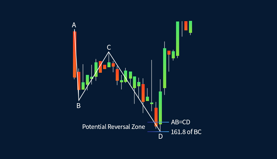 一旦形態確立,就可觸發交易,無論是買進還是賣出。在下面的圖表中,形態完成於D點,其中AB=CD。此外,BC的161.8延伸位和D共同確定了潛在的反轉區。在本例中,終端價格線錘子線測試了D點和BC的161.8延伸位。在該形態結束時出現的錘子線,預示著看跌走勢的結束,新的上升走勢的開始。這是您的買入機會。
