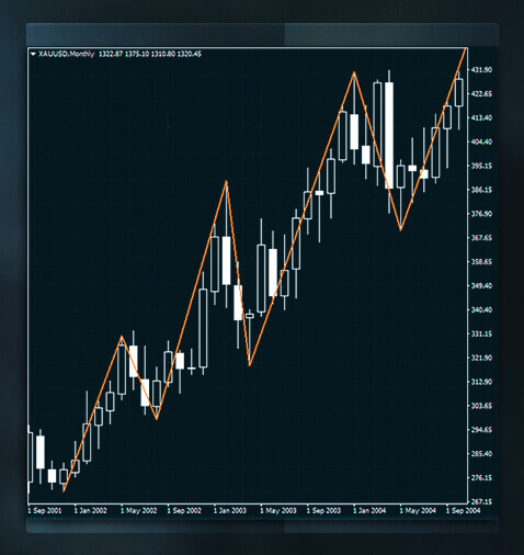 連續的更高的頂部(或波峰)和更高的底部(或波谷)形成的形態為上行趨勢。在這種趨勢中,需求超過供應,阻力位不能承受住買盤壓力。這樣,價格突破阻力位,在圖表上錄得更高的高點。
