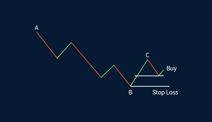 沒有風險管理規則的交易體系是不完整的,更確切地說,設置保護性止損是為了應對入市後的意外價格波動。止損位戰略性地設置於B點下方,若價格跌至B點下方,則看漲形態失效。