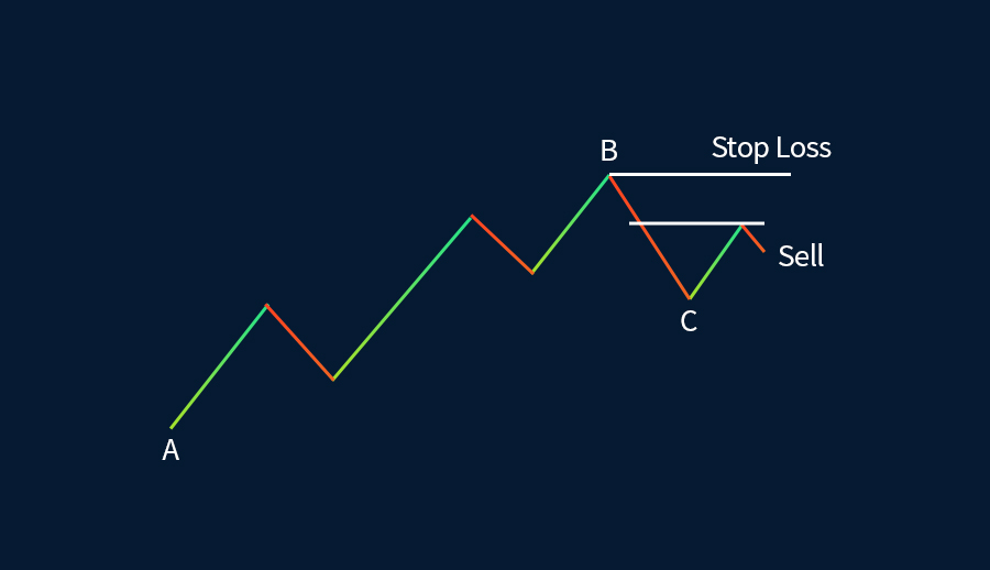 同樣地,為了保護投資者的本金,設置保護性止損必不可少。止損位戰略性地設置於B點上方,若價格升至B點以上,則看跌形態失效。